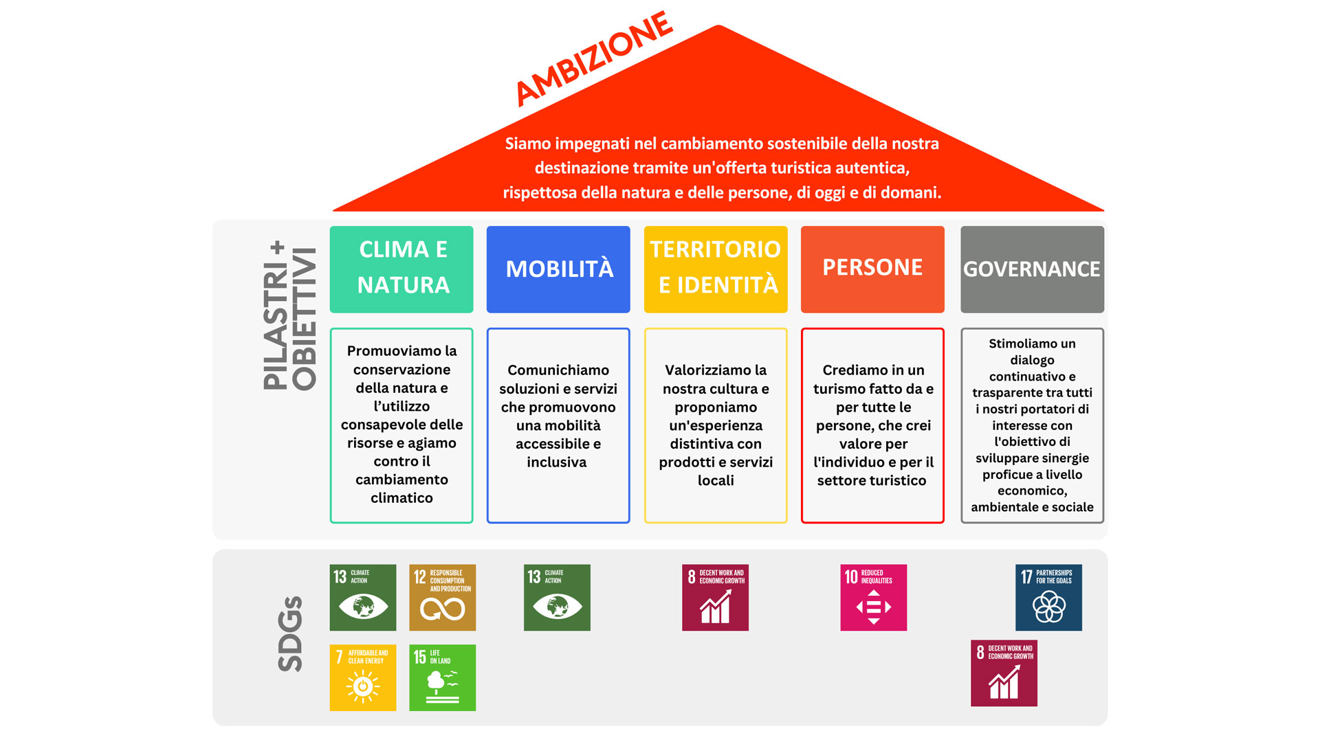 Das Projekt Sustainability Roadmap, gefördert von Ticino Turismo und den vier regionalen Tourismusorganisationen (OTR) mit finanzieller Unterstützung der Wirtschaftsabteilung des Finanz- und Wirtschaftsdepartements (DFE) und in Zusammenarbeit mit dem Unternehmen Quantis, hat zu bedeutenden Ergebnissen geführt, die dazu beigetragen haben, die Position des Tessins als nachhaltige und innovative Destination zu stärken. Die Ausrichtung der Strategie an den Zielen für nachhaltige Entwicklung (Sustainable Development Goals, SDGs) hat die Kohärenz des Projekts mit internationalen Standards weiter gestärkt und bietet einen Rahmen für zukünftige Massnahmen. Der konkrete Aktionsplan, den wir "Sustainability House" genannt haben, basiert auf den SDGs und den fünf Säulen der Makrokategorien, auf denen wir unsere zukünftige Arbeit aufbauen werden: Klima und Natur, Mobilität, Gebiet und Identität, Menschen und Governance. Jeder Säule wurde eine Reihe praktischer Massnahmen zugeordnet, die darauf abzielen, das Tessin zu einer Vorreiter-Destination für nachhaltigen Tourismus auf nationaler und internationaler Ebene zu machen.