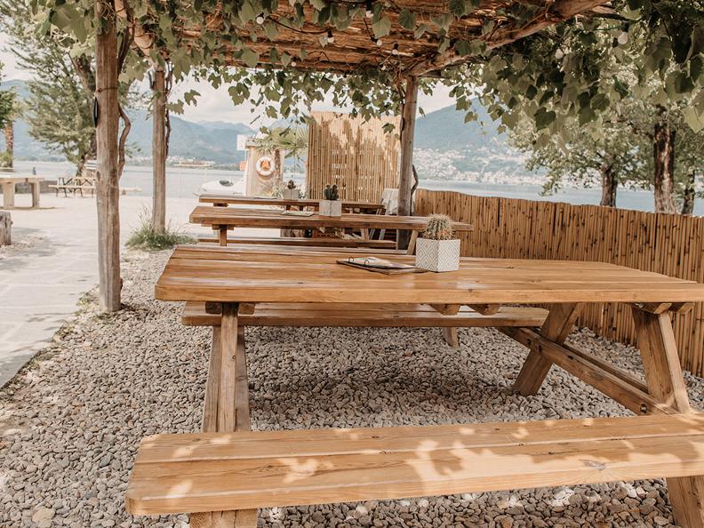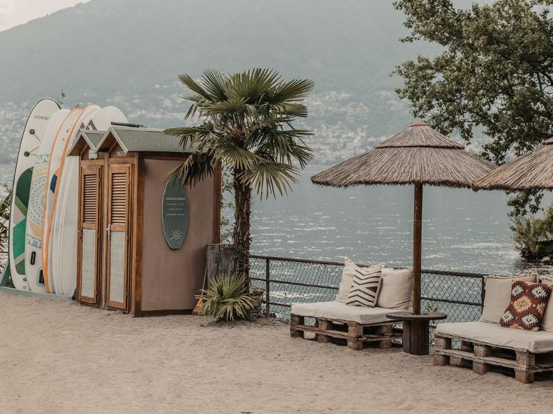 Shaka Beach ist eine Strandbar mit Blick auf den Lago Maggiore, bekannt für ihre atemberaubenden Sonnenuntergänge, die Schaukel im Wasser und das tropische Ambiente. Entspanne dich mit einem Cocktail und lass dich von der Urlaubsstimmung mitreißen.