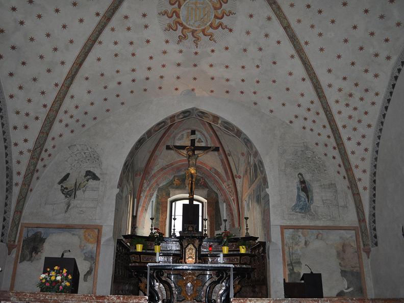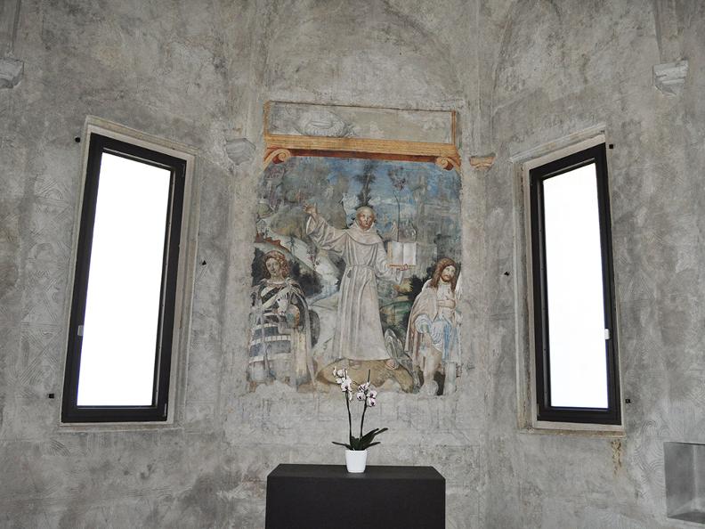 Das Innere, welches durch eine breite Querwand aufgeteilt ist, wie dies bei Franziskanerkirchen üblich war, beeindruckt durch seine räumliche Harmonie. Die Querwand ist von einem grossen Fresko überdeckt, in dessen Stil sich die Eleganz der Renaissance mit einer spontanen, dekorativen Grazie vereint. Im Zentrum befindet sich eine "Kreuzigung", und in fünfzehn darumherum angeordneten Bildern ist das Leben Christi dargestellt. Das Werk verdanken wir einem begabten, leider unbekannten lombardischen Maler, der es 1495-1505 entstehen liess.