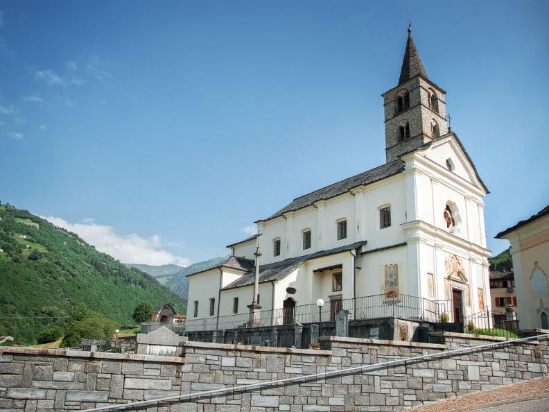 Schöne perspektivische Wirkung dank der invertierten Orientierung der Kirche seitens des Arch.Giandomenico Frasca aus Lugano. Die Hauptfassademit zwei Reihen von Lisenen wurde 1732 vom berühmten lokalen Maler Carlo Biucchi mit Fresken bemalt.