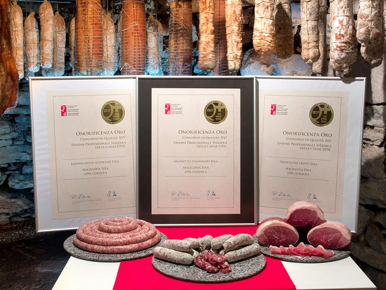 Dank unsere Hingabe und Liebe zum Detail haben wir beim Schweizer Qualitätswettbewerb der USPC im Jahr 2017 drei Goldmedaillen mit folgenden Produkten gewonnen: einheimische Luganighetta, gereifte Salami und Rohschinken.
