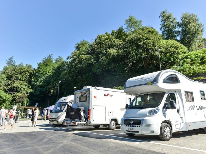 Der spezielle Parkplatz für Wohnmobile oder Wohnwagen besteht aus 8 Stellplätzen, die mit Trinkwasser, Strom und mit Tischen und Bänken aus Stein ausgestattet sind.