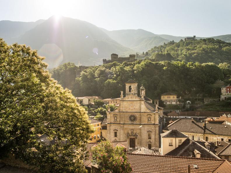 Dieser Renaissancebau wurde nach dem Entwurf eines Meisters, Tomaso Rodari aus Maroggia (Bildhauer und Architekt des Dorns von Como), erstellt. Die stattliche, aus dunklem Castione-Stein erbaute Fassade, überragt die hohe Freitreppe und schliesst zwischen den kleinen, noch im Frührenaissancestil gehaltenen seitlichen Portalen, das prächtige, im oberen Teil mit dem Stadtwappen verzierte Hauptportal ein. Von besonderem Interesse ist die grosse zwölfstrahlige Rosette (5 m Durchmesser) die Ende 15. Jhdt, anfangs 16. Jhdt entstanden ist. Das einschiffige Innere aus dem 16.-17. Jhdt ist reich an Stukkaturen aus dem 17. Jhdt und weist eine doppelte Reihe von Seitenkapellen auf, die mit Gemälden aus verschiedenen Jahrhunderten, vorwiegend aus dem 17. Jhdt, geschmückt sind und von berühmten Malern stammen wie Pier Francesco Mazzucchelli (genannt Morazzone), Camillo Procaccini, Bartolomeo Roverio (genannt il Genovesino). Unter den Fresken ist besonders das 1770 entstandene Werk des Locarnese Giuseppe Antonio Felice Orelli "Musizierende Engel" erwähnenswert. Wunderschön ist das Hauptaltarbild, eine dem Maler Simone Peterzano zugeschriebene Kreuzigung Sehenswert ist die im Jahre 1784 entstandene Kanzel aus poliertem farbigem Gips (eine Nachahmung kostbaren Marmors) und das sich beim Eingang (links vom rechten Seitenportal) befindende Weihwasserbecken. Dieses wird auch "fontana trivulziana" genannt, da es im 15. Jh. ein Schlossbrunnen im Besitz der Herren Trivulzio von Mesocco war. Eine getreue Nachahmung dieses Kleinods lombardischer Bildhauerkunst des 15. Jhdts steht im Schloss der Sforza in Mailand. Die Collegiata, Eigentum der Stadt Bellinzona, ist Sitz der katholischen Kirchgemeinde des Stadtzentrums. Sie wird von einem Kapitel von Chorherren unter einem Erzpriester verwaltet. An die nördliche Seitenmauer der Kirche lehnt sich das Gebetshaus der Hl. Martha. Das aus dem 17. Jhdt stammende Gebäude wurde im 18. Jhdt umgebaut und in den Jahren 1967/1968 ganz renoviert. Das Innere besteht aus einer rechteckigen Aula, deren Wände im Jahre 1762 vollständig mit Fresken varesischer Maler überdeckt wurden. Auch die gewölbte Decke ist bemalt und stellt den "Triumpfder Hl. Martha" dar, der Heiligen, deren Holzstatue aus dem 17. Jhdt auf dem 1763 geweihten Marmoraltar thront.