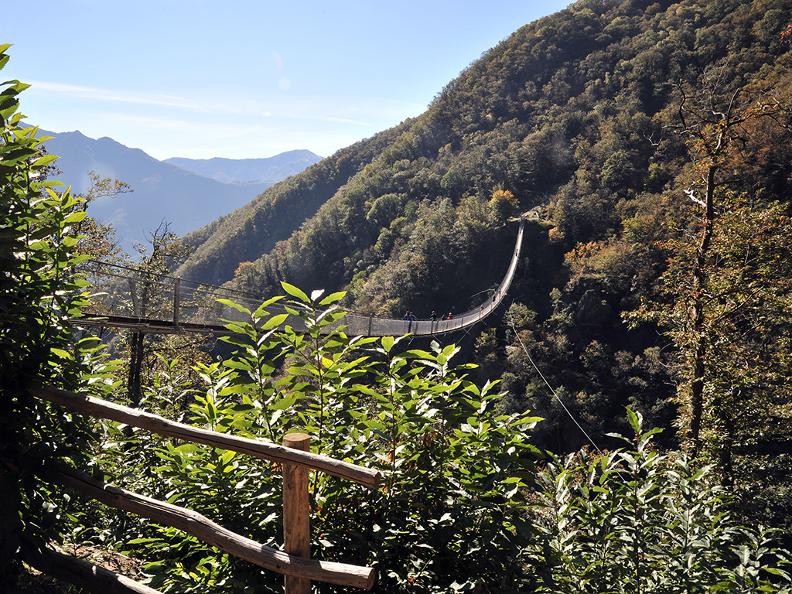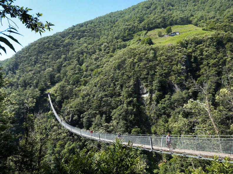 Auf einer Höhe von 696 m befestigt, schwebt die Brücke auf 130 m über dem Boden. Der Brückenboden ist kaum einen Meter breit und aus Lärchenholz gebaut. Das Durchlaufen der Brücke ist eine einmalige Erfahrung. Dank der beträchtlichen Sicherheitsmaßnahmen kann jeder diese wunderbare Erfahrung machen, sei es geübte Wanderer, Jugendliche oder Familien.