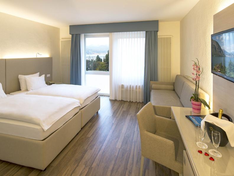Einige Zimmer verfügen auch über Terrasse oder Balkon mit Sicht auf den See oder die Berge.