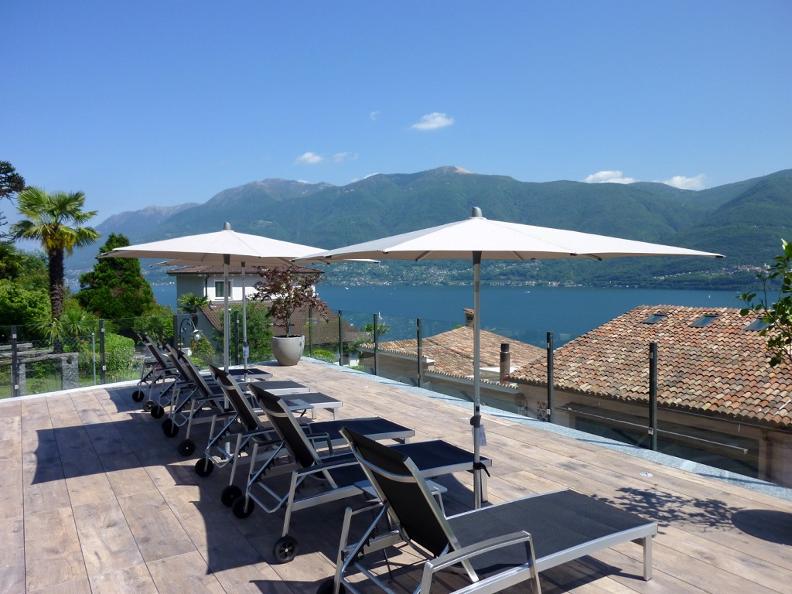 2 ZWG in Tessinerhaus, 1. Stock, geheizter Pool 4x8m, Jakuzzi, Sauna, Garten, Pergola, alles neu renoviert, sonnig, ruhig, PP, Waschküche, Fitnessraum, Babyzubehör gratis, See-Bergsicht.