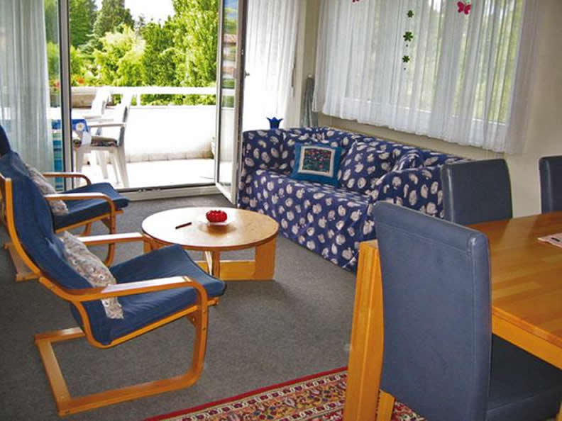 Tisch, Stühle und ein Liegestuhl laden zum Verweilen ein. Die Wohnung (70m2) ist nett möbliert und besitzt 1 Schlafzimmer mit 2 Betten, ein grosses Wohnzimmer mit Esstisch, 2 Schrankbetten, Sofa und TV/Radio, Badezimmer mit Badewanne/WC, separater Küche und Balkon.