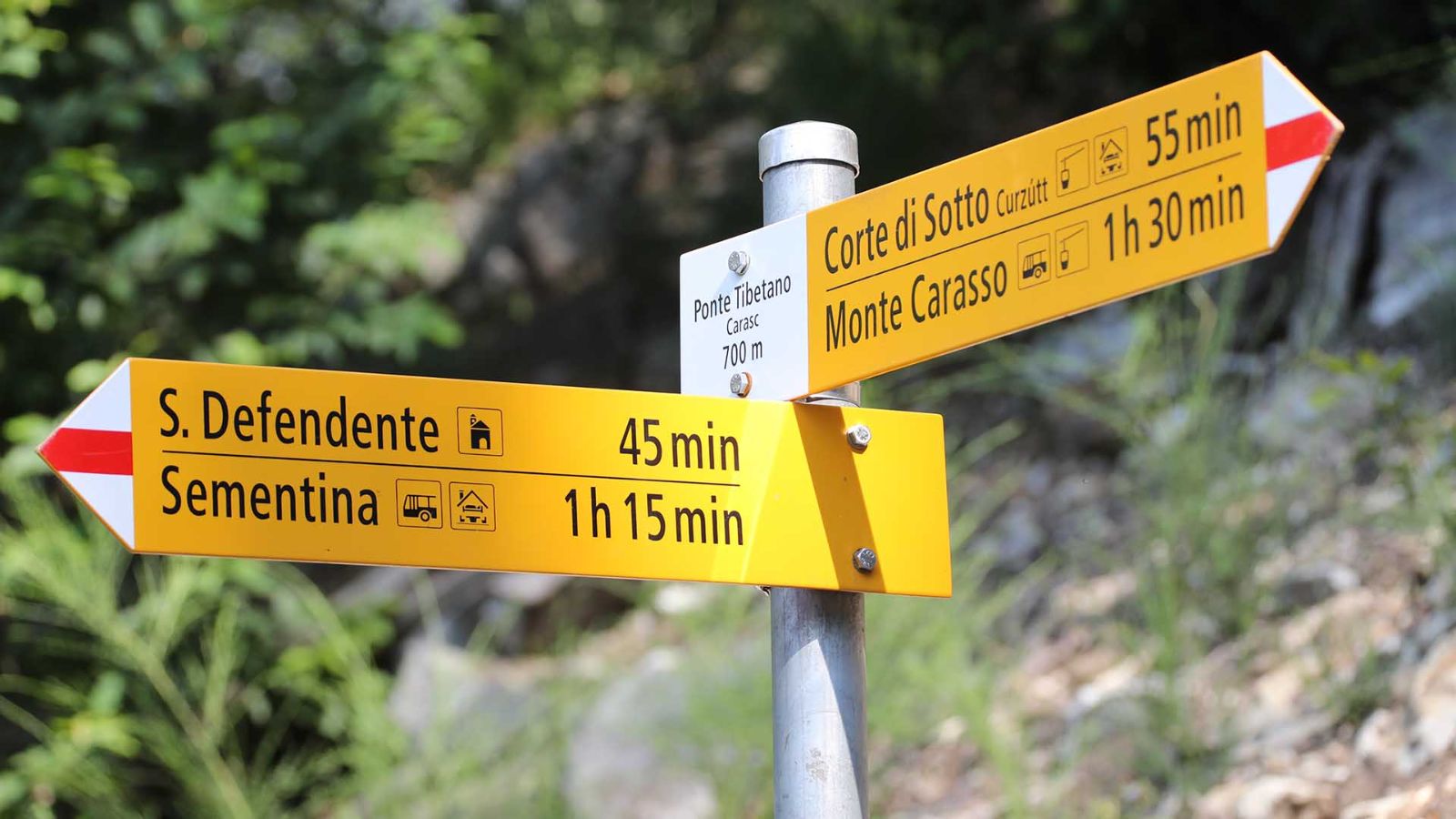 Der Blick durch die Spalten zwischen den Dielen aus Lärchenholz lässt keinen Raum für Träumereien: Man schaut hinunter auf das 130 Meter tiefer liegende Tal. Im Moment haben Sie aber festen Boden unter den Füssen und es ist noch reichlich Zeit. Sie haben Ihren Nachmittag der Entdeckung der einzigen Tibetischen Brücke im Tessin gewidmet. In Monte Carasso haben Sie die Seilbahn genommen, um nach Curzútt zu gelangen, haben einen Kaffee auf der Terrasse in der Sonne getrunken und den alten Ortskern, wo jeder Stein eine Geschichte zu erzählen hat, durchquert. Der Schaukel auf dem Spielplatz konnten Sie nicht widerstehen, und haben den Himmel mit den Zehenspitzen berührt.