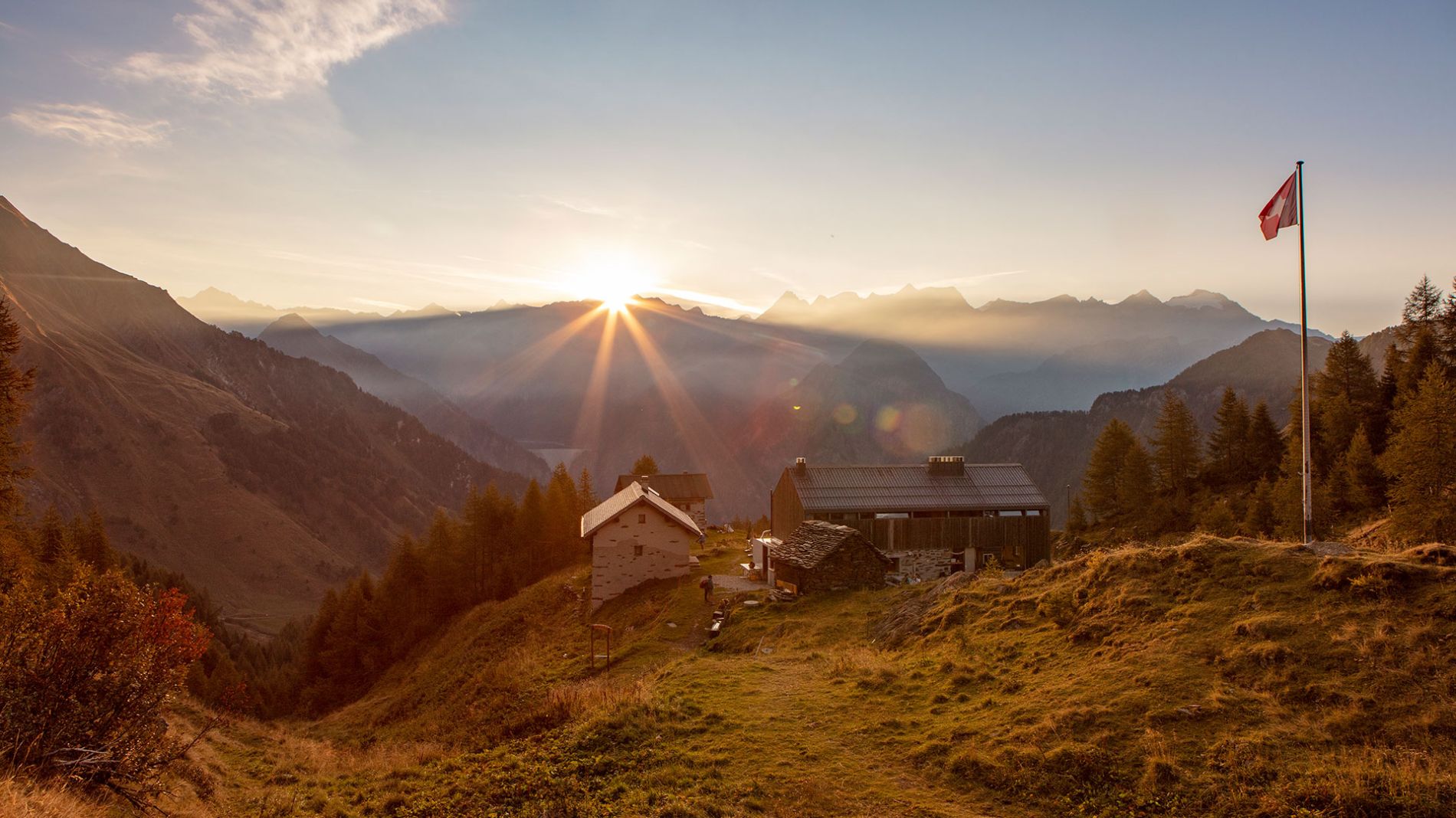 Wir befinden uns auf 1'870 Höhenmetern am Ende des Bleniotals kurz hinter Olivone. Hier thront die Capanna Bovarina UTOE hoch über dem Tal und beschert einen Blick auf Campo Blenio und die Staumauer von Luzzone. Die Bergluft ist frisch und würzig, die Sonne strahlt.