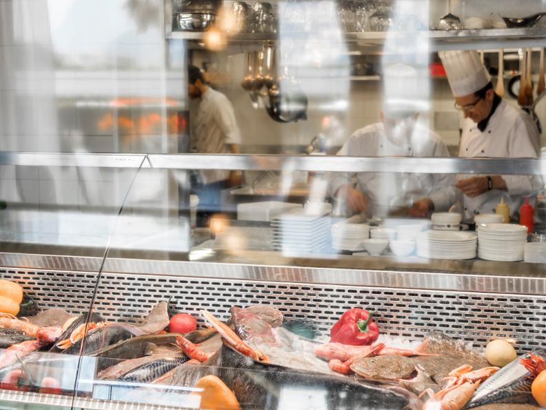 Die Protagonisten unserer Kreationen, wie der tagesfrische Fisch, das Muschelbecken mit neun verschiedenen Austernsorten und Aquarien mit Hummern und Langusten empfangen Sie schon im Eingang.