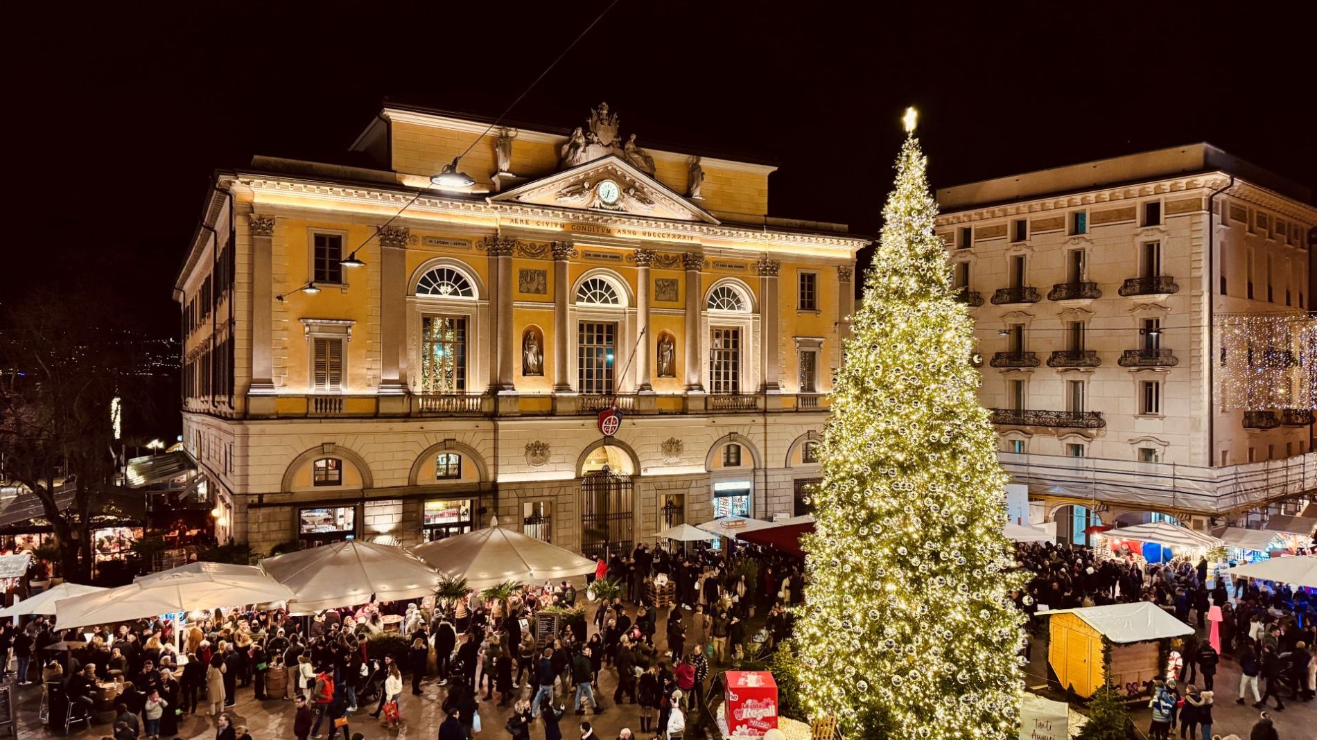 Auch an Silvester erstrahlt Lugano in Magie, Lichtern und Traditionen – mit dem grossen Weihnachtsbaum auf der Piazza della Riforma als pulsierendem Mittelpunkt.