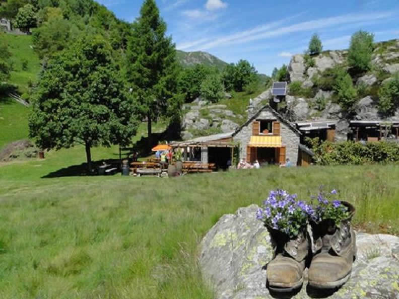The building, originally built in 1890 as a stable, was first renovated in 1970 and converted into a hut, then since 2010 it has been renovated and has become a cosy and pretty structure. The hut-grotto can only be reached on foot. It is located in a very sunny spot, where there is a wonderful panorama, with a 360° view, from Lake Maggiore to the Magadino plain and the surrounding mountains. Monti di Lego is located between the Val Resa in Brione sopra Minusio and the municipality of Mergoscia, of which it is part. It is a good starting point for excursions to the Verzasca Valley and the Maggia Valley, and ideal for starting or finishing the ‘Via Alta Vallemaggia’. The grotto has an indoor hall with 16 places and a large outdoor area, the upper floor houses the dormitory, and outside there are two bathrooms and a shower. Simple Ticino dishes are served in our grotto, and every day we offer minestrone, cold meats and cheeses, cheese and home-made cakes. On Sundays and public holidays, an additional menu such as polenta accompanied by meat/cheese is offered, and in warmer periods other tempting proposals. All products are typical of Ticino and are prepared in our kitchen with wood-burning stove, which also serves to heat the hut. Reservations are always welcome. The overnight stay includes dinner and breakfast, excluding drinks. We take into account the wishes of our guests in the case of intolerances or food choices, if we are informed in advance. Should you wish to spend a night in the hut bringing your four-legged friend, the presence of dogs is accepted with prior notice and agreement with the guardian; dogs are excluded from the dormitory. For overnight stays, reservations are compulsory and must be made by e-mail or telephone. The Monti di Lego hut-grotto is open from Thursday to Tuesday, Wednesday is closed for weekly rest. It is recommended to phone in case of uncertain weather, and is closed in case of heavy rain. Methods of payment cash (CHF or EURO) and Twint. It is not possible to pay with credit cards. We have been running the hut for many years and wish to convey our enthusiasm for this corner of paradise to you.