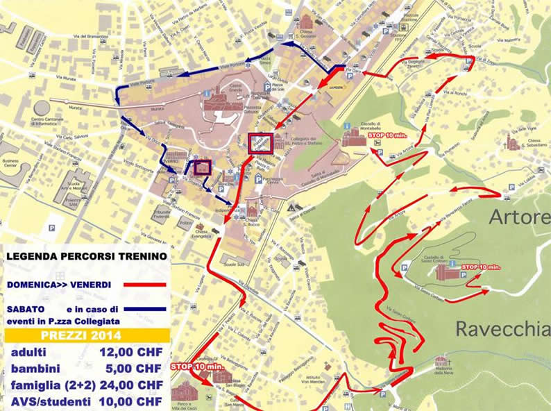 The tourist train service is available during the summer season, bringing visitors to Montebello Castle and Sasso Corbaro Castle. The direct link is able to comfortably transport 35 passengers, who can sit back and enjoy a spectacular view throughout the trip.