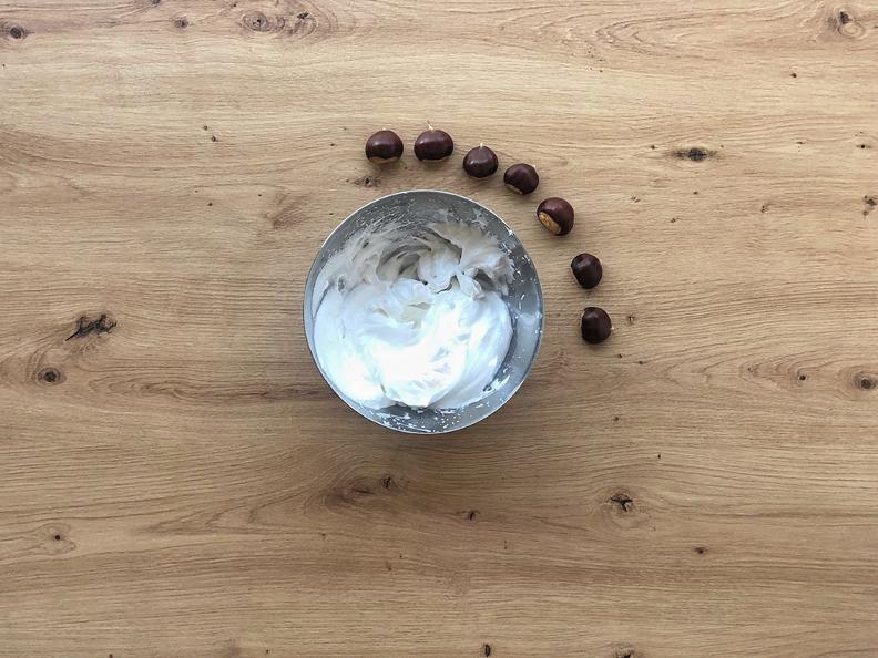 - Work the chestnut puree with the yolks, sugar and almonds;