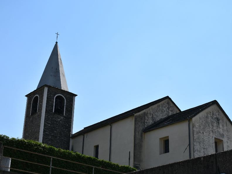 Inside, the nave is punctuated by four bays with a barrel vault; above the choir rises a pendentive dome. On the entrance wall and on the left, in front of the baptistery, fragments of late Gothic frescoes that could be attributed to the workshop of the Seregnesi, especially in the figures under the capital representing the Madonna with Child and a saint: typical of that workshop are in fact the frames with perforated motifs. For the other two figures of saints we could refer to Antonio da Tradate who worked at the beginning of the sixteenth century. Along the walls there are some chapels; in the one dedicated to St. Anthony of Padua the stucco altar is from the seventeenth century; in the chapel dedicated to the Madonna the statue is from the nineteenth century, the frescoes of the vault (Assumption with angels) of the seventeenth century. On the high altar in marble of Arzo an altarpiece with Crucifixion of the nineteenth century.