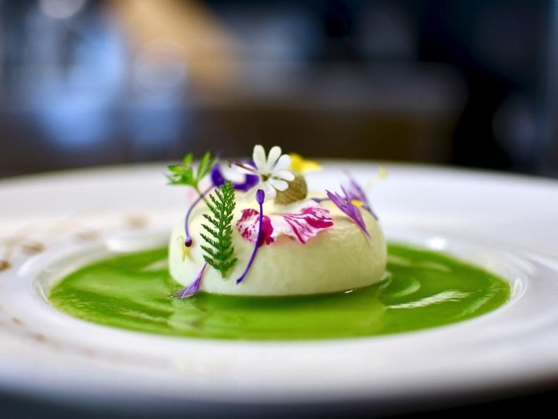 Spread the pea and asparagus sauce in a circle in the center of the plate and place the cream cheese on top. Garnish with wild herbs and flowers and finish with a drizzle of extra virgin olive oil.
