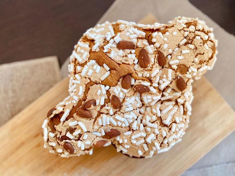 - Mix the ingredients for the icing well and gently brush the surface of the dove. Place a few whole almonds on the icing;