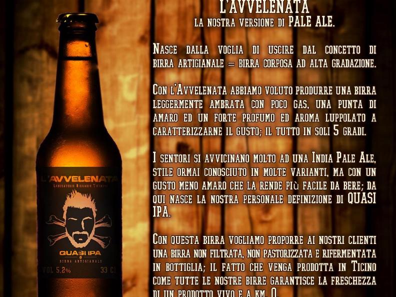 A brewfirm born in 2017 that currently produces two types of beers: L'Avvelenata, an "almost IPA", and Scirocco, a belgian amber ale with mandarin and pepper flavored from the Maggia valley.