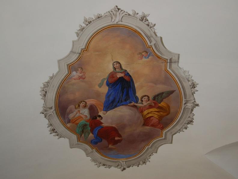 Inside, the choir was frescoed in the seventeenth century with scenes from the life of St. Anthony the Abbot. The paintings are framed in stucco.
