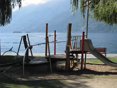 On the lakefront of Brissago.Some public parking nearby, 5 minutes from the bus stop.Several games: swings, sand, a rope tower, a giant chessboard, a tower with a slide, some wooden benches.