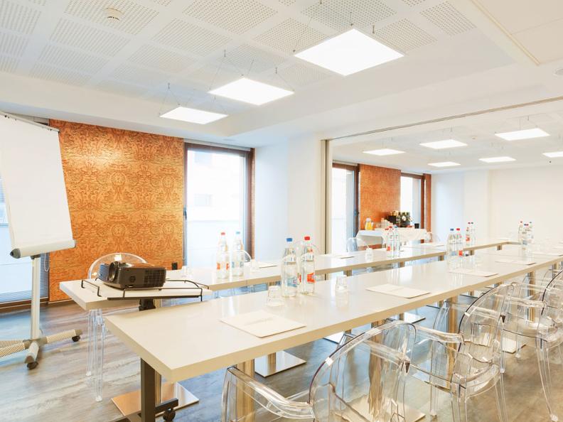 The hotel has 4 modular conference rooms: Oro, Rame, Argento and Bianca. These meeting rooms are particularly cosy as they enjoy ample natural sunshine. Between the Oro and Rame rooms there is a modular door that allows for an 80m2 room, while the Argento and Bianca rooms combined create the hotel's largest room of 120m2. All rooms benefit from air conditioning / heating, sound system, Wi-Fi and technical equipment.