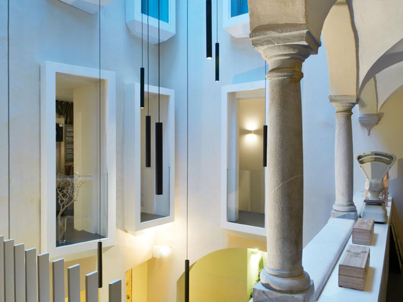 The rooms featuring a modern design, are placed in the 2nd, 3rd and 4th floor of the building, crowning an ancient central courtyard defined by beautiful arches part of an old convent.