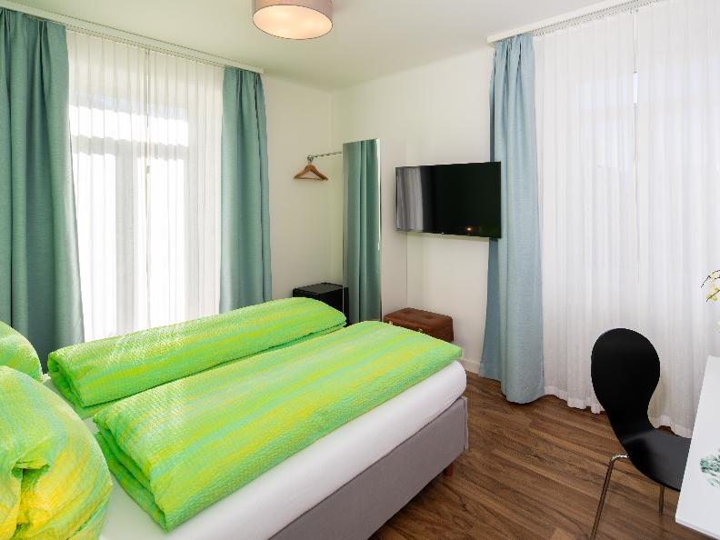 The 12 double rooms are spread over 3 floors and all have their own bathroom, fridge and free WLAN.