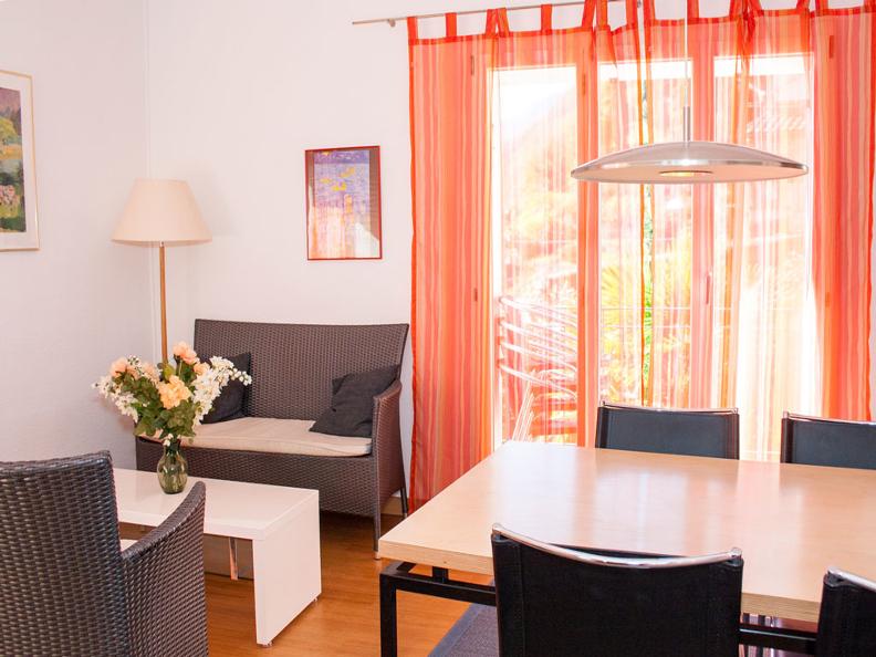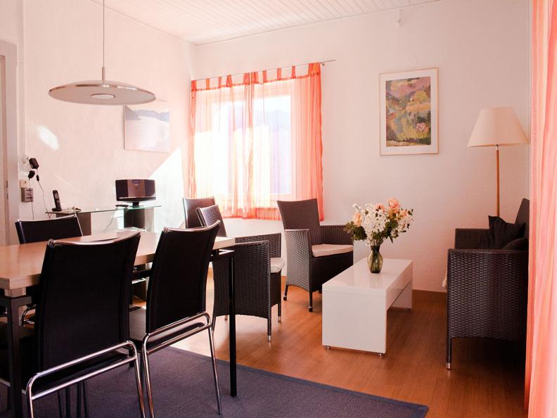- Open kitchen with dining table. Sitting area with sofa, 2 armchairs and coffee table. Radio and telephone.
