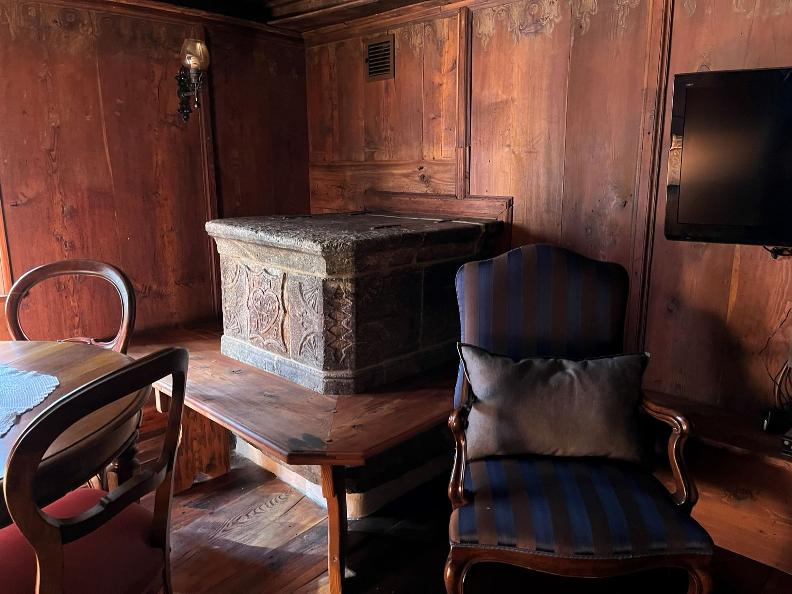 The typical room made of decorated wood, the soapstone stove (Kachelofen), and the historical wooden cabinets allow guests to discover both the past and enjoy the present.
