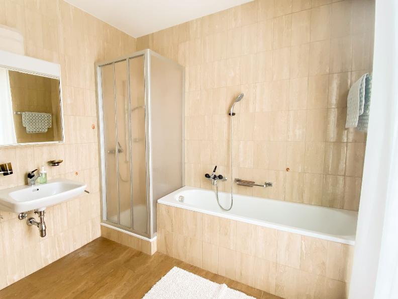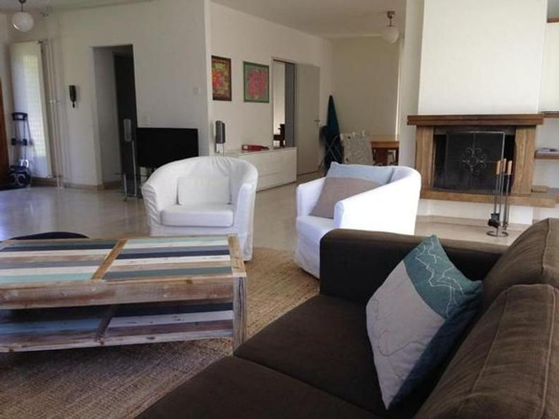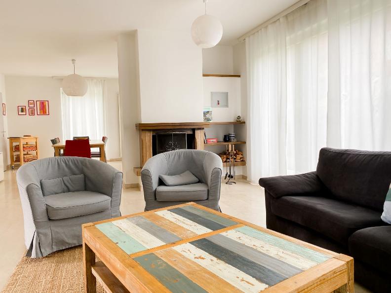 One family house of 5 1/2 rooms, 180 m2. Ground floor: large living room with chimney connected with the dining room with dining table for 12 people. Separate kitchen with dishwasher, refrigerator, freezer and oven. 1st floor: 3 sleeping rooms with each 3 beds. 1 separate toilet; 1 bathroom with bath tub, shower and toilet; 1 separate shower and toilet. Washing room, fenced garden. Parking place in the garage of a nearby condominium.