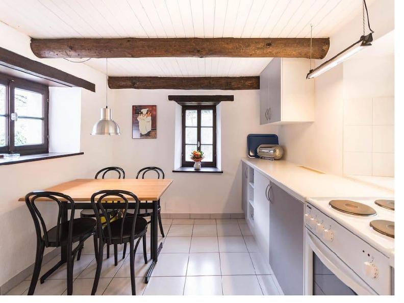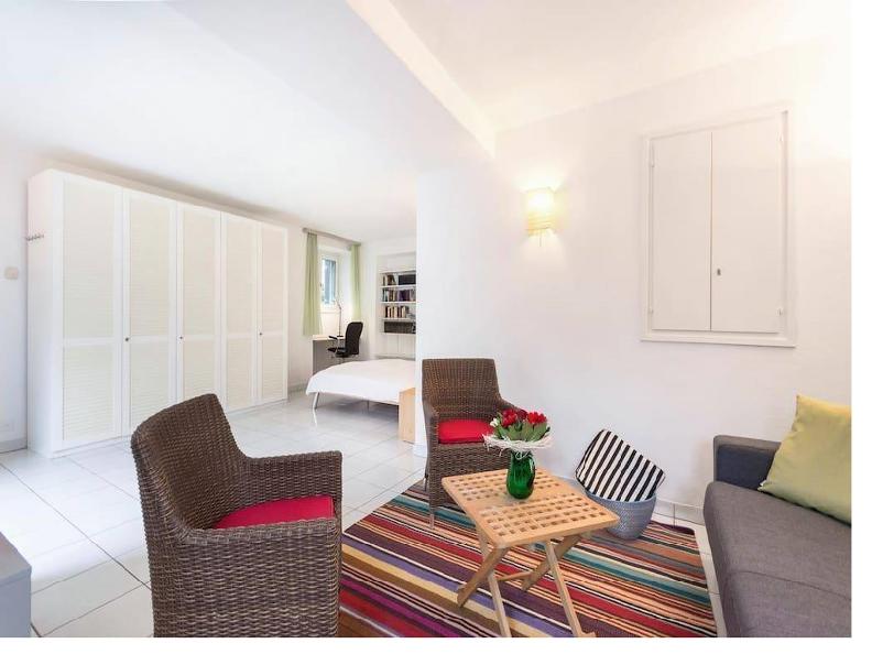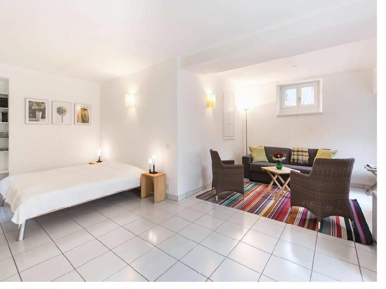 Spacious studio (approx. 50m2) with separate kitchen, incl. dining table for 4 persons, dishwasher, espresso machine, stove with oven, complete apartment with bright ceramic floor, underfloor heating, separate entrance, private garden with two seats for single use. The apartment is furnished with new, modern furniture. In addition to satellite TV, DVD and CD players, a small collection of books completes the offer.