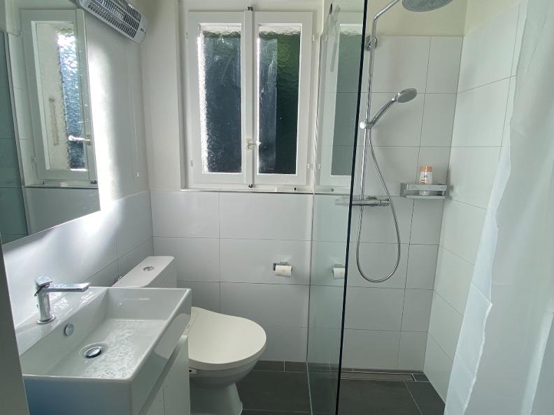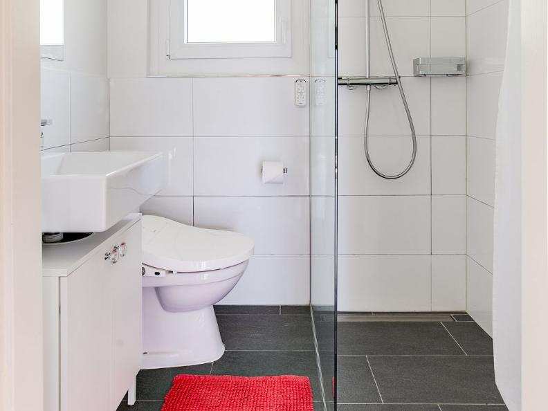 Shower/toilet: walk-in shower, shower toilet (bottom shower), electric heating, hair dryer, base cabinet, first aid kit
