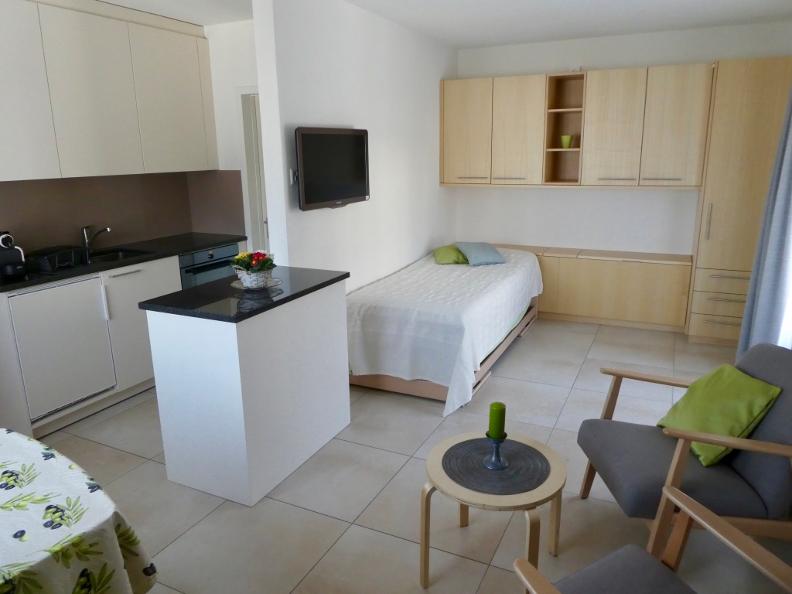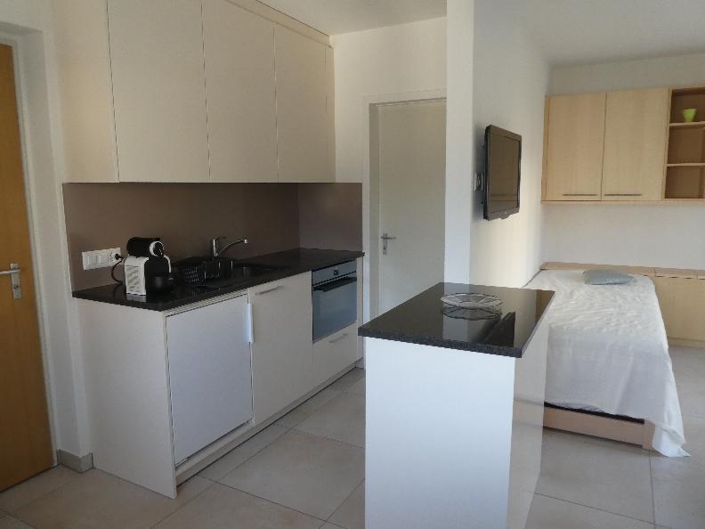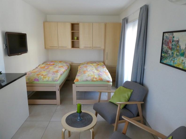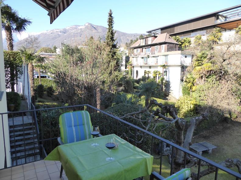 Small cozy, completely newly renovated studio with balcony on the garden side and view into the mountains with evening sun. Small seat with morning sun and views over Ascona and the lake. Living/bedroom with 1-2 beds, adjustable separately or next to each other, dining table, seating group; Kitchen combination. WC/shower. Behind the house invites you to linger a large garden, surrounded by trees and palm trees with granite table, granite bench and barbecue area