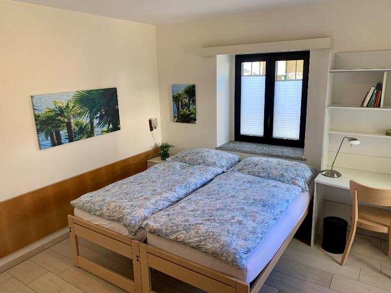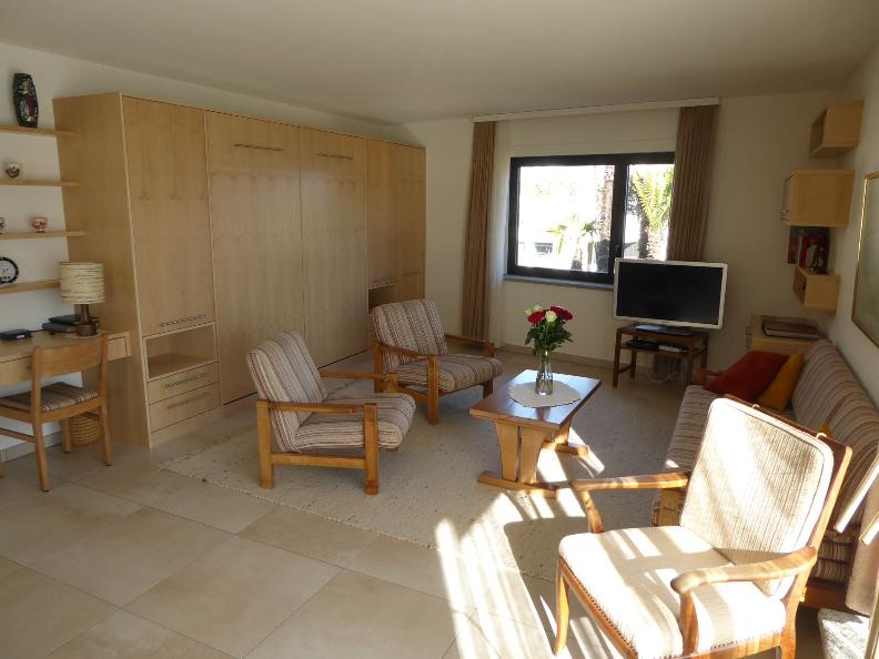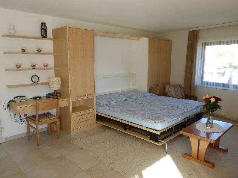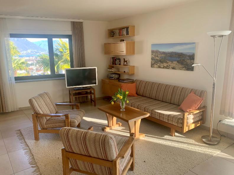 Appartement lumineux et confortable de 3 chambres avec balcon et vue fantastique sur Ascona, le lac et les chaînes de montagnes environnantes. Grand salon avec fenêtres panoramiques et deux armoire-lits. Une salle de bains avec toilette/baignoire, une salle de bains avec toilette/douche. Derrière la maison il y a un grand jardin, entouré d'arbres et de palmiers avec table de granit et barbecue, et est idéal pour les enfants avec table de ping-pong, tour d'escalade avec toboggan, balançoire et bac à sable