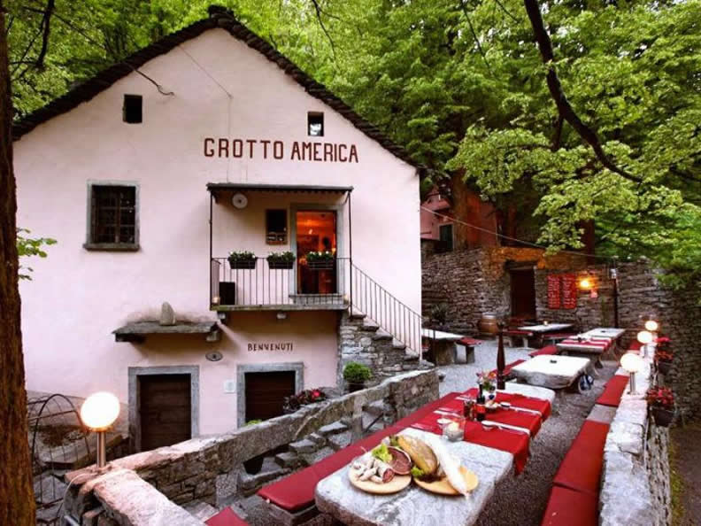 Grotto America, a beautiful, ancient grotto immersed in greenery, next to the Maggia River. It is part of the village of Ponte Brolla, which dates from the mid-19th century, and is surrounded by ancient grottoes. The village was once one of the region's main meeting points, where travellers waited for convoys heading for the port of Genoa, hoping to be able to sail for North America. The village has kept the same name until the present day. Original paintings can still be seen on the house created by a family of emigrants from Ticino who made their fortune overseas. When they returned from their journey, they bought the Grotto and named it America in memory of their destination.