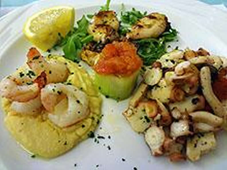 - Spiedino di gamberi e calamari su passata di ceci