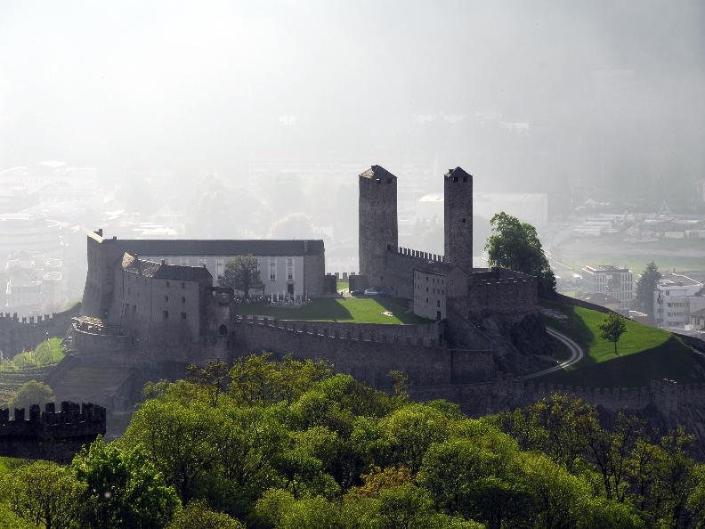 La première installation humaine sur la colline San Michele remonte au Néolithique (5500-5000 ans avant J.-C.). Le IVe siècle après J.-C. voit la construction de la première fortification attestée d’un point de vue archéologique. Divers documents du VIe siècle évoquent également l’existence d’une structure fortifiée. Au XIVe siècle, le château est pour la première fois appelé Castrum Magnum, Castel Grande, sa désignation actuelle, même si d’autres noms apparaissent au fil des siècles: château d’Uri (1630, sous la domination des Confédérés), château d’Altdorf ou encore château de Saint-Michel (1818).