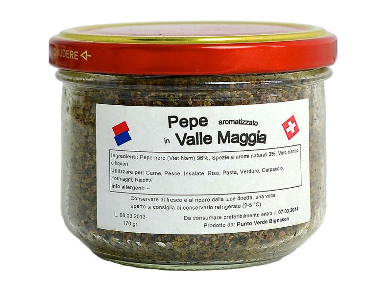 "Le Pepe della Valle Maggia, même si ce poivre ne pousse pas dans la vallée – ni dans aucune autre localité tessinoise – doit son nom à son inventeur Virgilio Matasci. Ce dernier, avec son fils Elis, enrichit l'épice dans son petit atelier familial situé à Bignasco, dans la Vallée Maggia précisément.