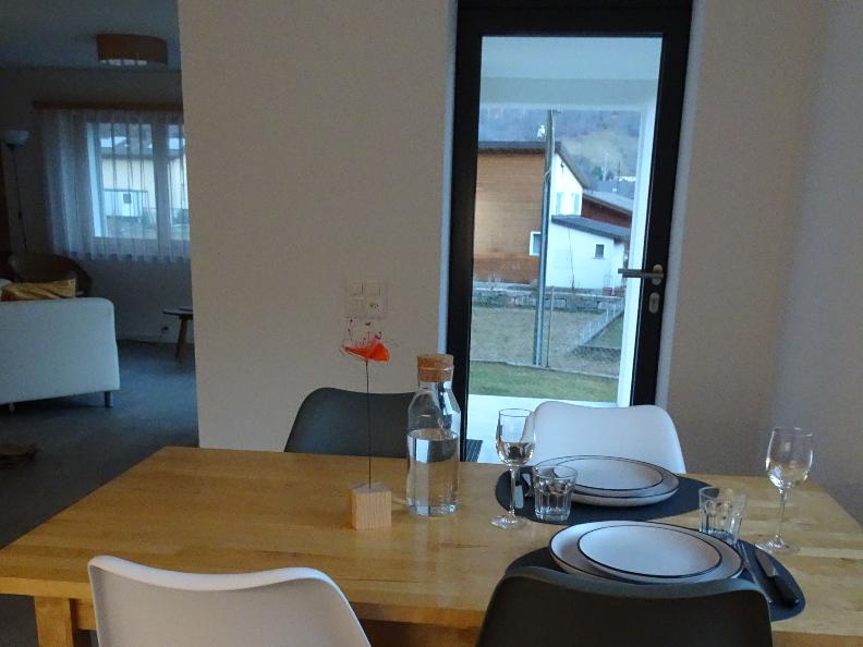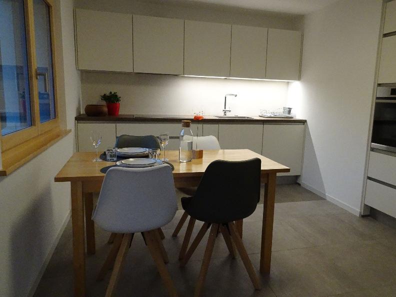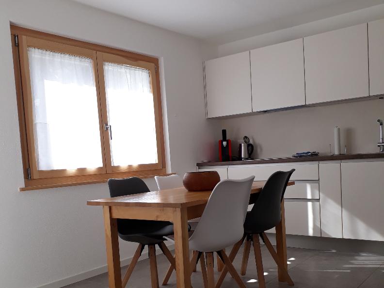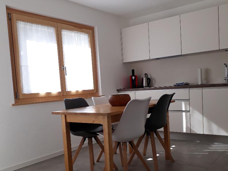 Grande cuisine (four, lave-vaisselle, 4 plaques vitrocéramiques, bouilloire électrique, machine à café avec capsules, service à fondue) et salon (TV câblée, radio, WiFi), 1 chambre double avec 1 lit double (160 cm x 200 cm), 1 chambre avec lits superposés, douche/toilette (sèche-cheveux). Chauffage avec thermopompe air/eau (serpentins). Parking gratuit près de la maison. Non fumeur.