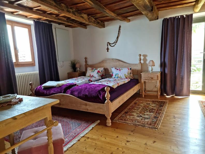 Le premier étage accessible par un escalier en pierre, la chambre spacieuse et meublée avec goût, avec balcon e vue partielle sur le lac.
