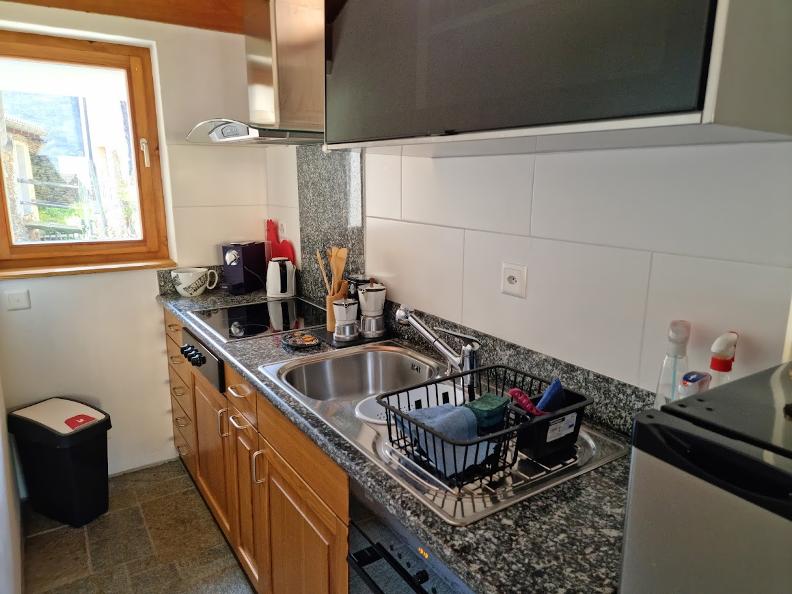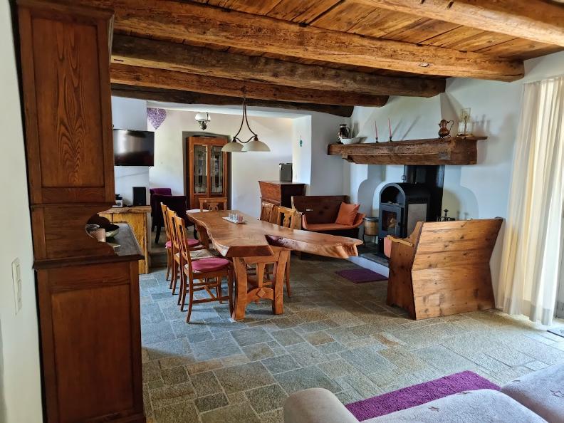 L'appartement de vacances (65 m2) se compose au rez-de-chaussée d'un salon spacieux avec un canapé-lit et une grande cheminée typique du Tessin, une petite cuisine, des toilettes et une douche.