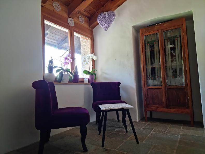 Devant la maison se trouve un siège avec une table et un banc en granit.