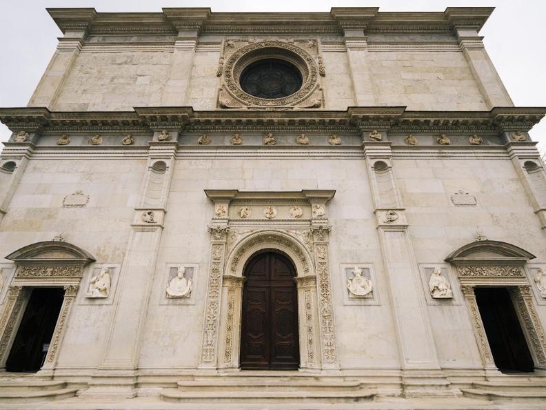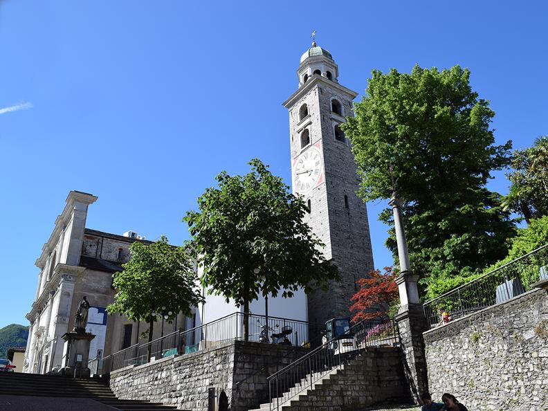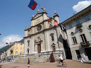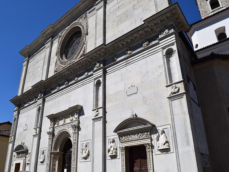 Di fondazione sicuramente protomedievale, la chiesa venne denominata parrocchiale già nel 818, collegiata nel 1078 e cattedrale dal 1888. Nella muratura, l'odierna costruzione è ancora per lo più romanica. Durante il tredicesimo ed il quattordicesimo secolo venne realizzato il soffitto a volte e la chiesa fu ampliata. La facciata a vento, eretta negli anni 1500/1517, costituisce uno dei capolavori del rinascimento lombardo. Il frontespizio, quattro pilastri portanti, il cornicione mediano in linea spezzata ed una trabeazione, sono elementi disposti in modo altamente armonioso. La cappella della Madonna delle Grazie fondata nel 1494 e ricostruita nel 1774 seguendo i progetti dell'architetto Giambattista Casasopra è riccamente ornata di colonne e di un altare in marmo.