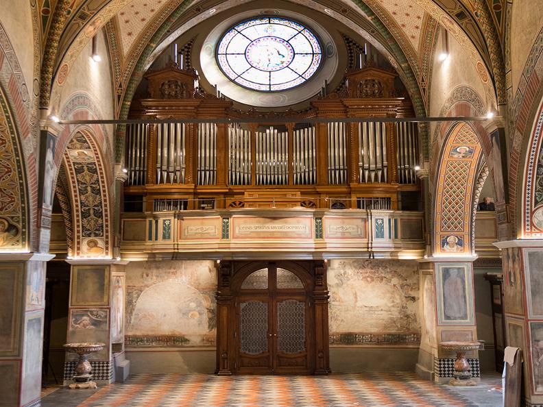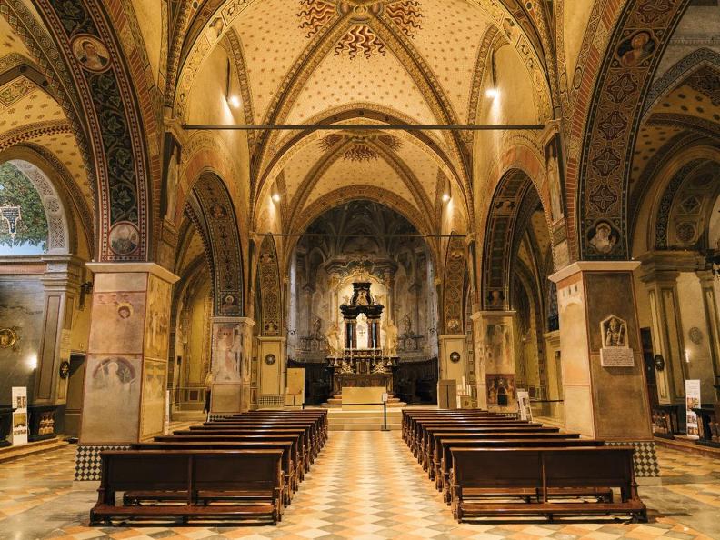 Al suo interno, gli affreschi più antichi si osservano sulla parete di controfacciata, sopra la volta a crociera impostata in epoca gotica: tracce di una scena del Giudizio Universale, un meandro prospettico, una testa d'apostolo ed un piccolo resto della voragine infernale, databili già al tredicesimo secolo.