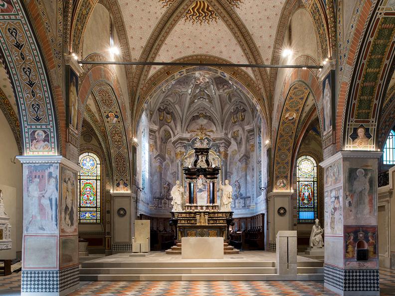 All'entrata del coro è posto il maestoso altare maggiore in marmo con sovrastruttura a tempietto decorato da putti, eseguito alla fine del Seicento su disegni di Andrea Biffi. Nell'ultimo vano della navata sud è conservato l'antico fonte battesimale ottagonale con iscrizione e data 1430.