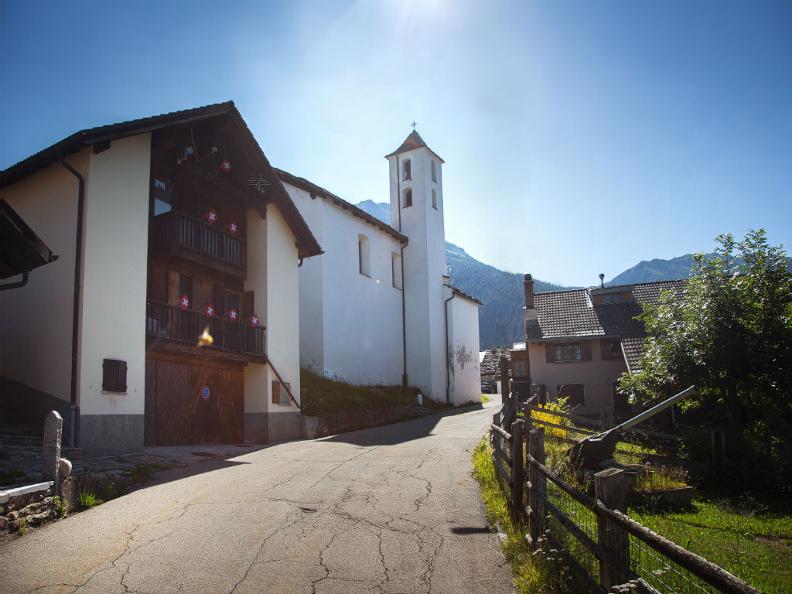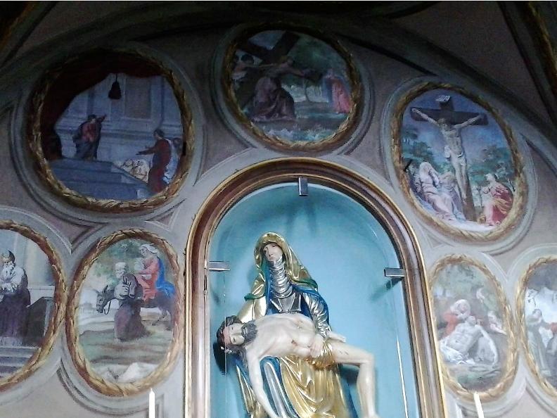 Particolarmente interessanti l'altare in legno scolpito e dorato del 1733 e un gruppo ligneo policromo dorato e argentato di stile nordico raffigurante la Pietà. La scultura, dall'espressione molto intensa, risale forse al XVI secolo; fu acquistata nel 1880 a San Gallo ed è posta nella cappella di sinistra.