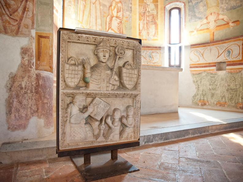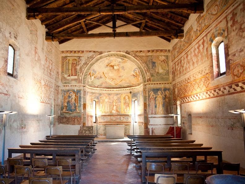 Sull'arcata dell'abside, nel registro superiore, un' Annunciazione; in quello inferiore Vergine con Bambino e tre Sante (Agata, Caterina e Agnese). Sulle pareti dell'abside la Majestas Domini e le storie di S. Pietro. Si tratta di opere di autore ignoto della prima metà del Trecento. Risale invece agli inizi del Quattrocento il riquadro raffigurante Dio Padre con Gesù Crocifisso, san Giovanni Battista e una donatrice che si trova nella parte inferiore sinistra dell'abside. Esso è vicino, per stile, agli affreschi di S. Maria in Selva a Locarno e Madonna dei Ghirli a Campione.