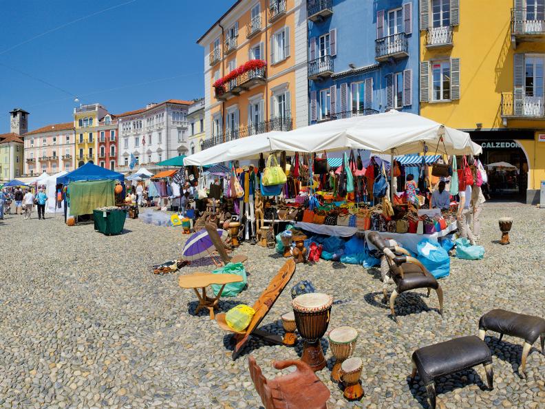 La Piazza Grande si popola di bancarelle con prodotti di ogni genere. Molto particolari e caratteristiche sono le bancarelle che espongono manufatti e artigianato locale: tessuti, creazioni in lana, oggetti in legno ed in ceramica. Al mercato si possono trovare anche prodotti gastronomici ticinesi, come freschissimi formaggini, uova, frutta e verdura dei nostri contadini. Non mancano venditori che offrono merce di seconda mano, come dischi, libri, musicassette e vestiti.