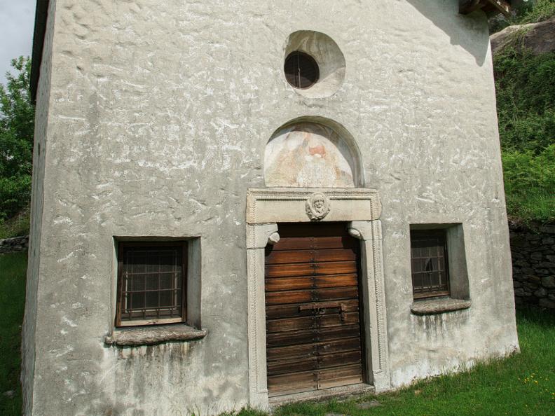Sulla parete sinistra del coro un affresco tardogotico rappresenta i Santi Rocco e Sebastiano. Sull'arco trionfale gruppo barocco dell'Annunciazione (XVII); della medesima epoca sulla parete destra della navata l'affresco dell'Assunta. L'altare a portelli di provenienza sveva è di notevole bellezza ed è opera di Ivo Strigel da Memmingen (1494). Nello scomparto centrale le statue raffigurano la Madonna e i Santi Giorgio e Marco; all'interno delle ante sono dipinti San Giacomo e Volfango ed all'esterno San Cristoforo e Sant'Anna Metterza.