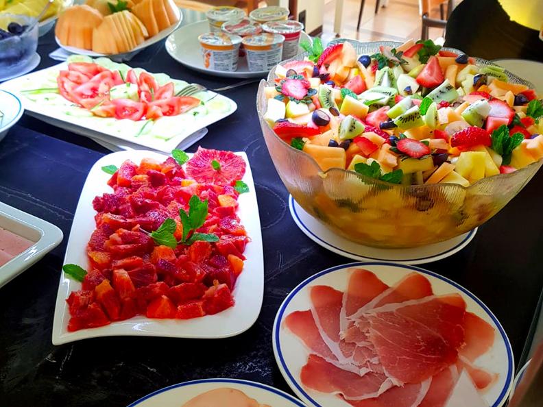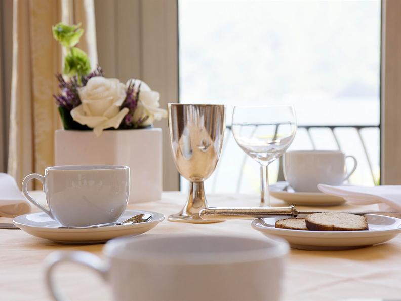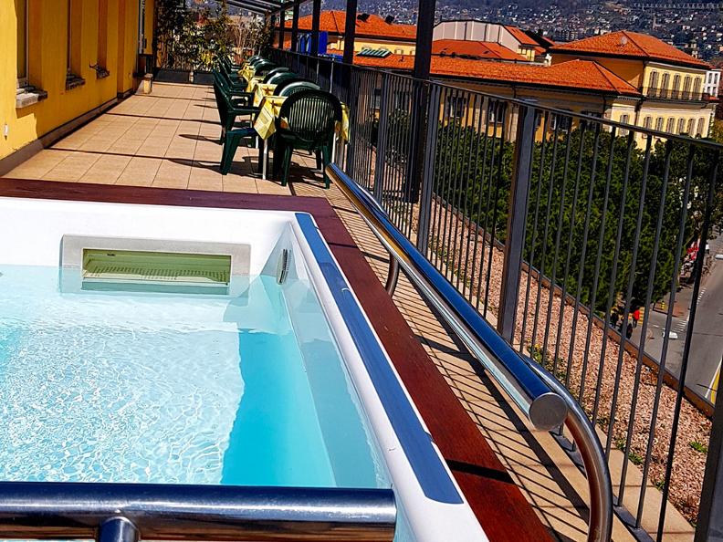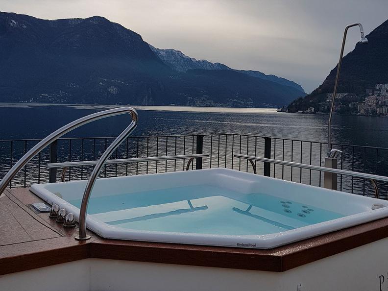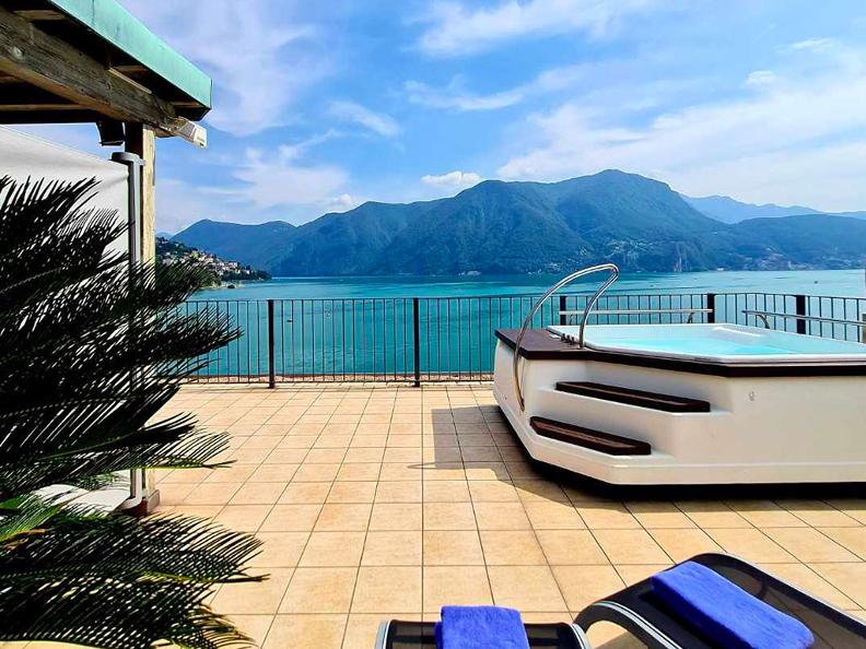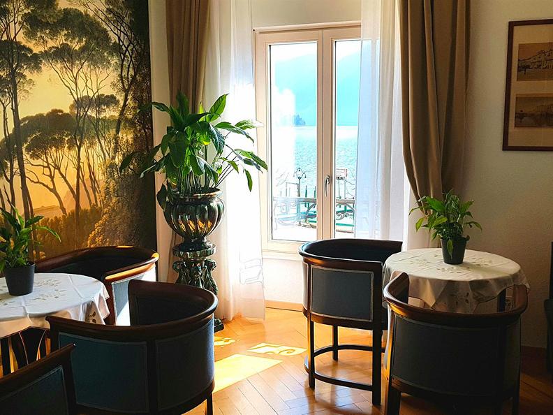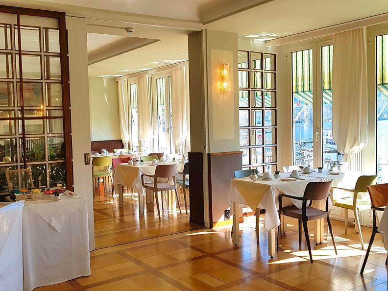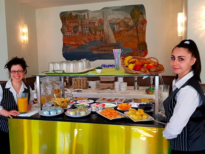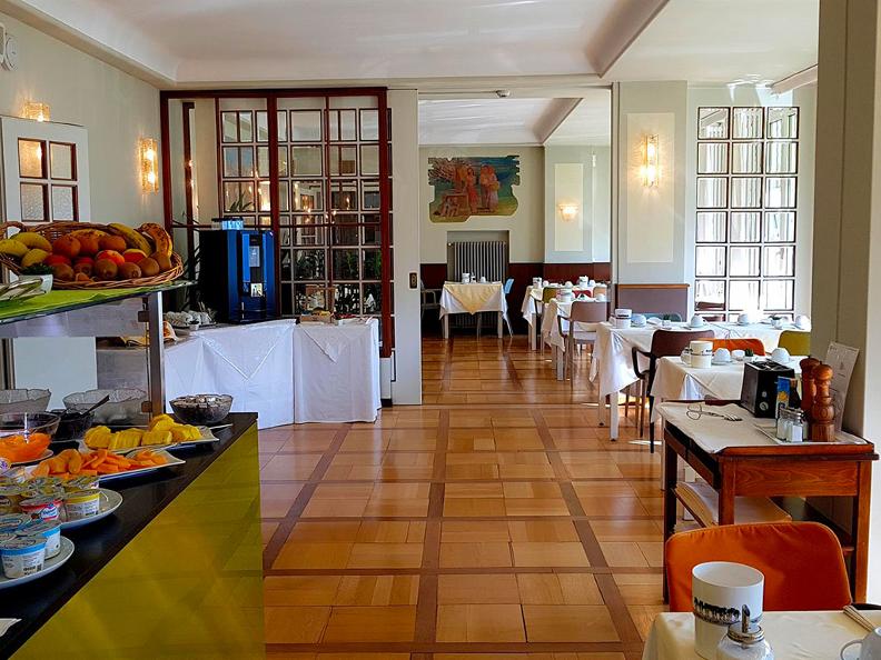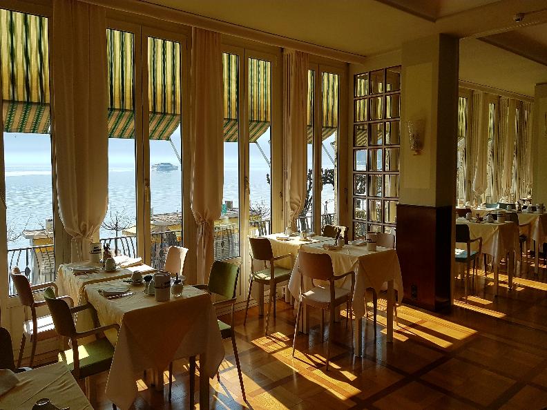All’ultimo piano terrazza panoramica. Il ricco buffet della prima colazione è servito al 1. piano con vista lago.